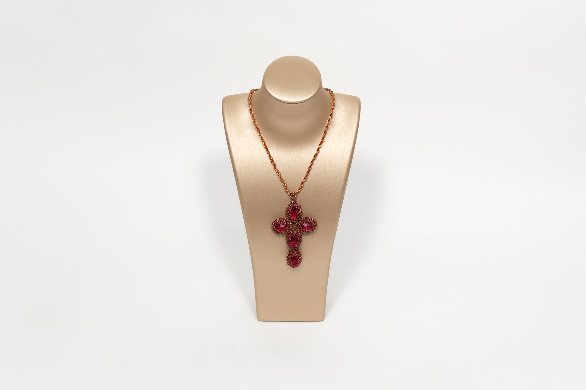 Crocifisso realizzato con elementi in vetro vintage incastonati con merletto chiacchierino realizzato con filato di seta e poliestere metallizzato color rame impreziosito da zirconi color rubino.