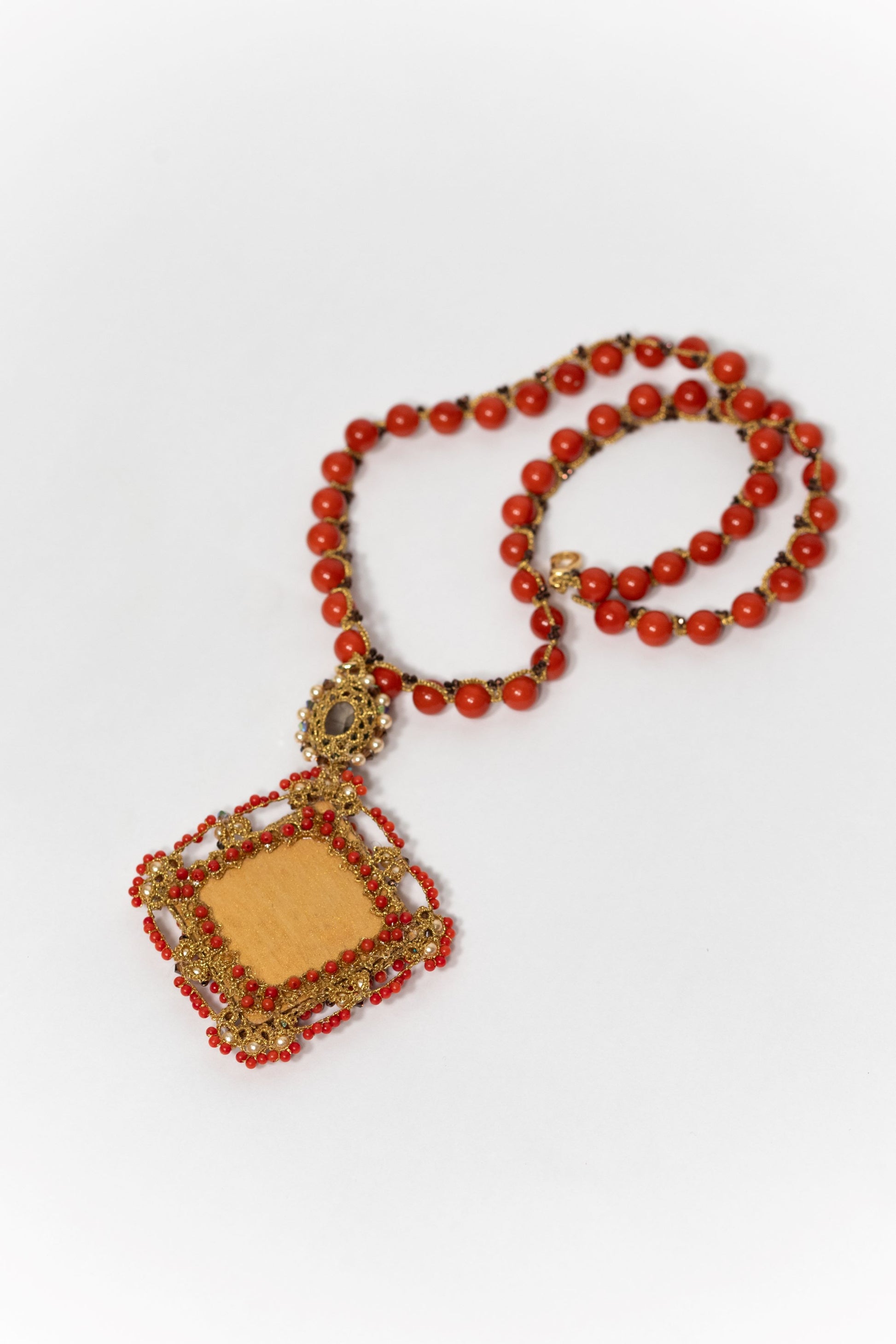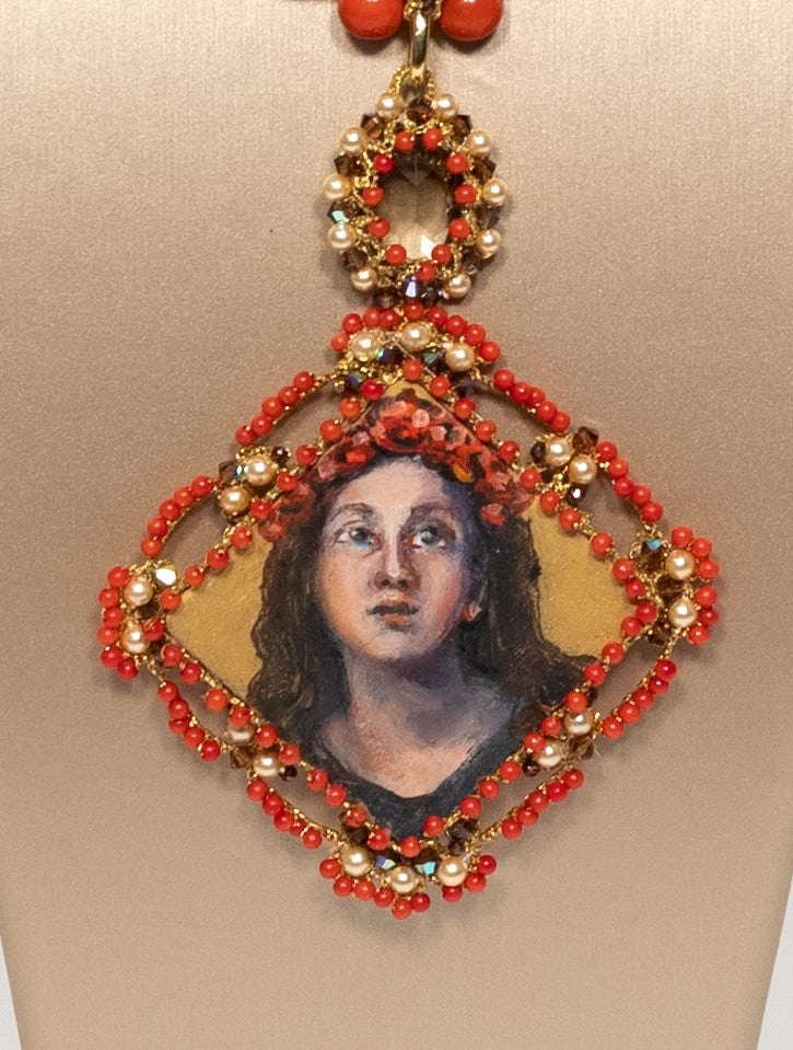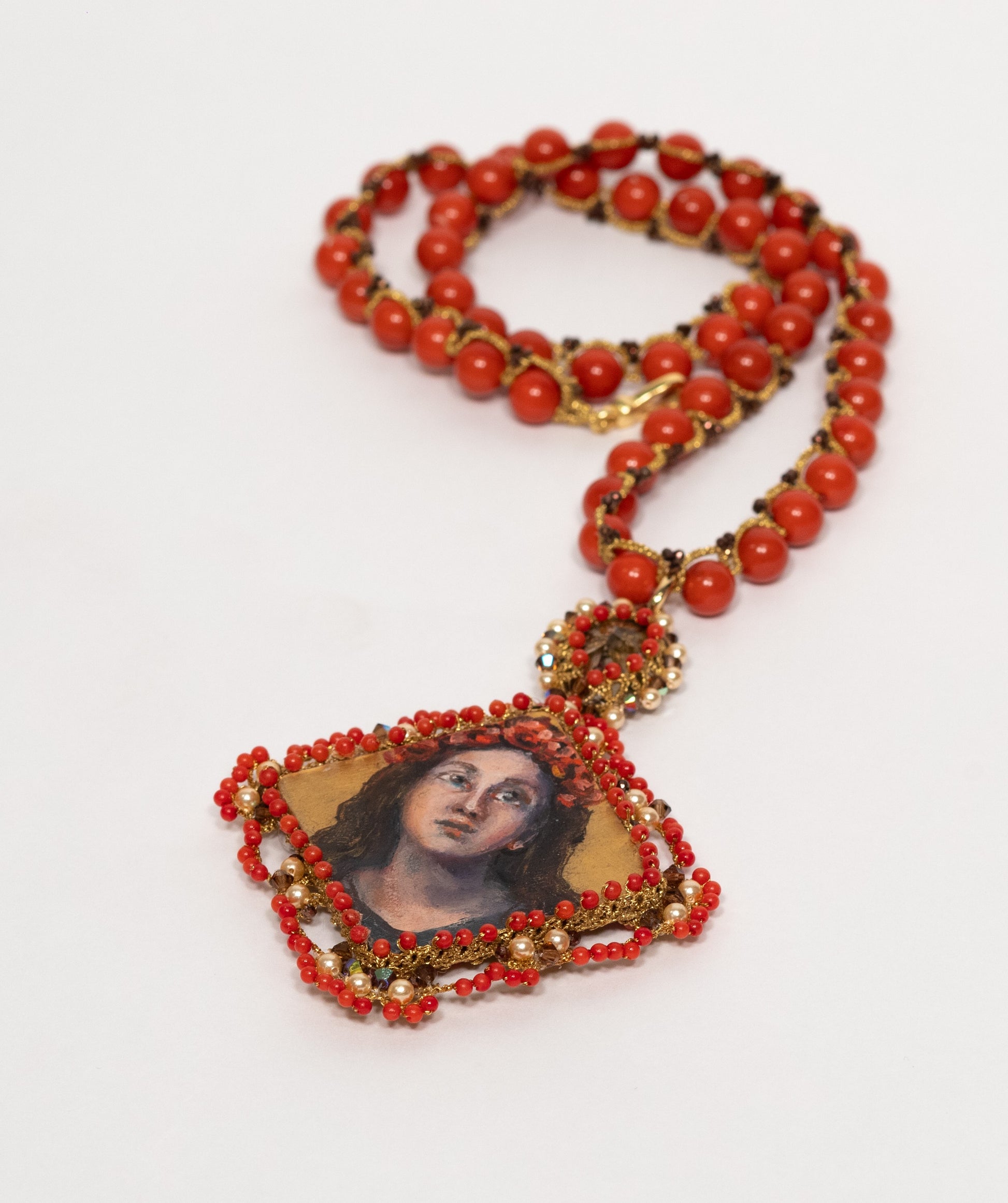 Collana con cammeo dipinto a mano dall'artista Giulia Crimaldi, montato su merletto chiacchierino ricamato con corallo e perle, scelte per il loro forte carattere simbolico.